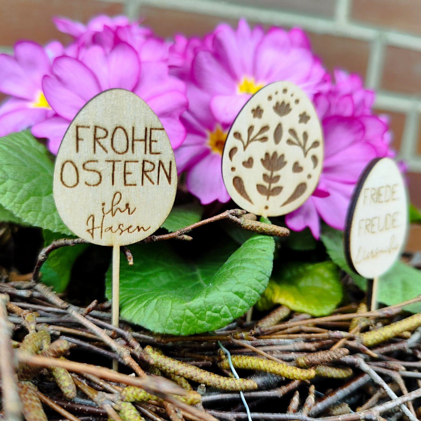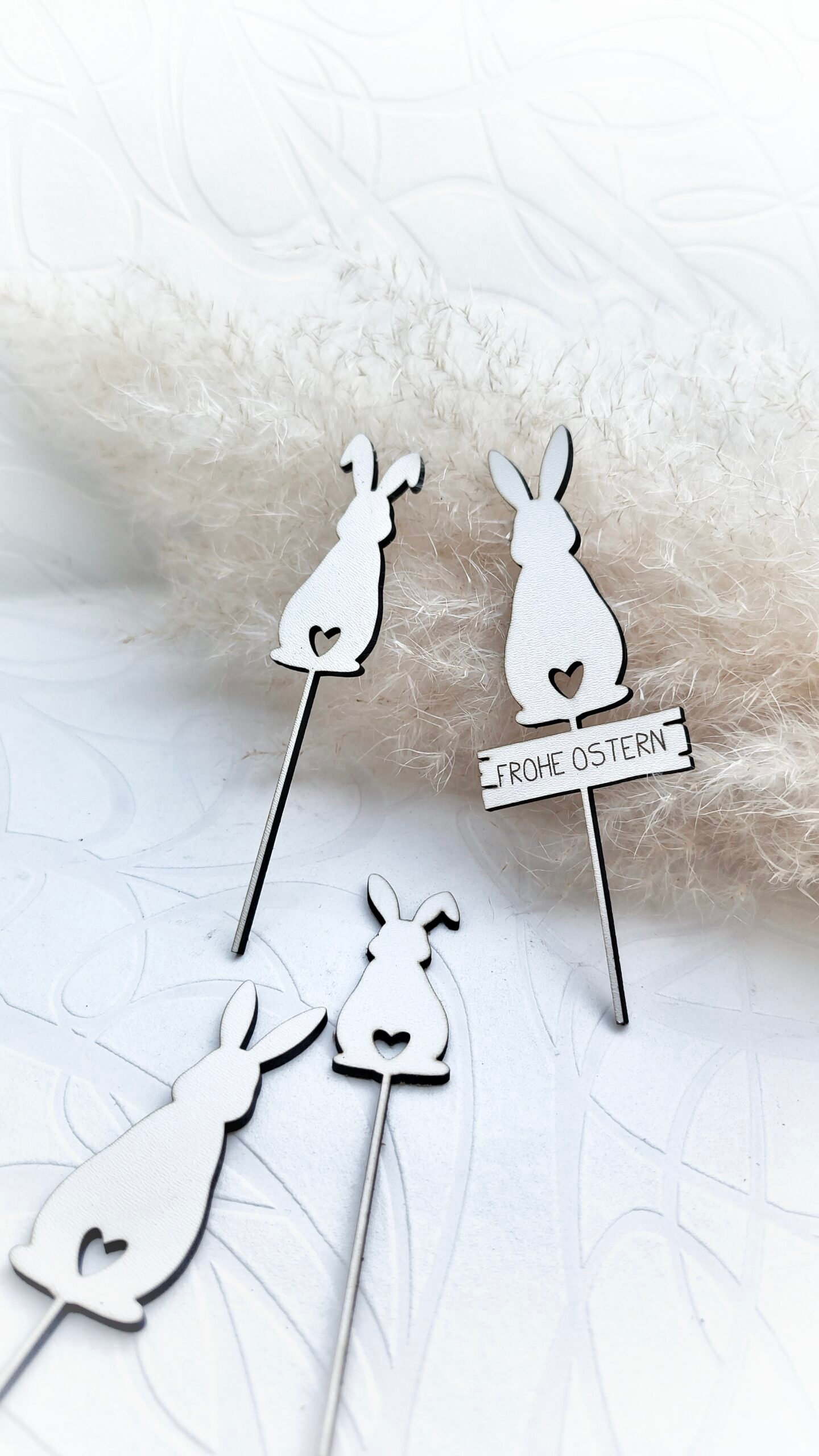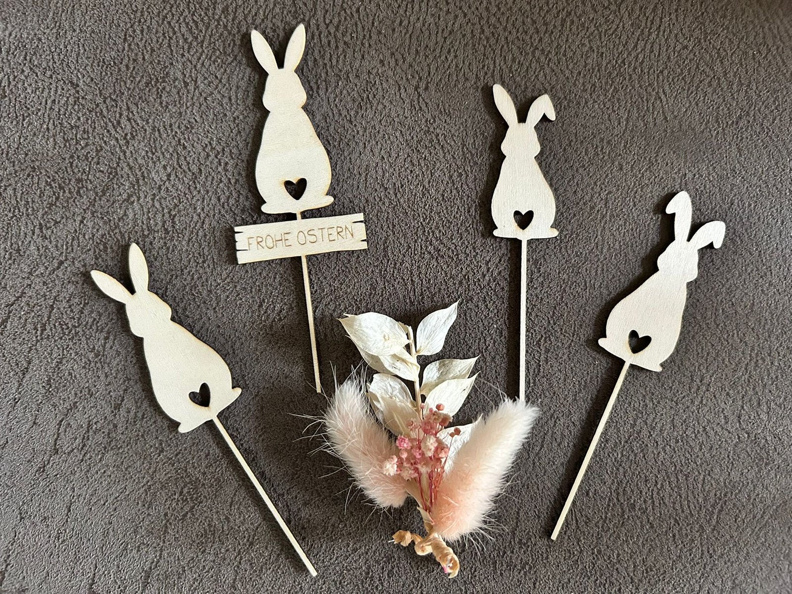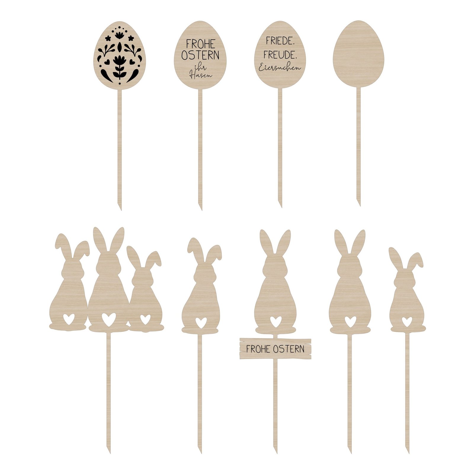 Dieses liebevoll gestaltete Set enthält verschiedene Hasen- und Eierstecker,