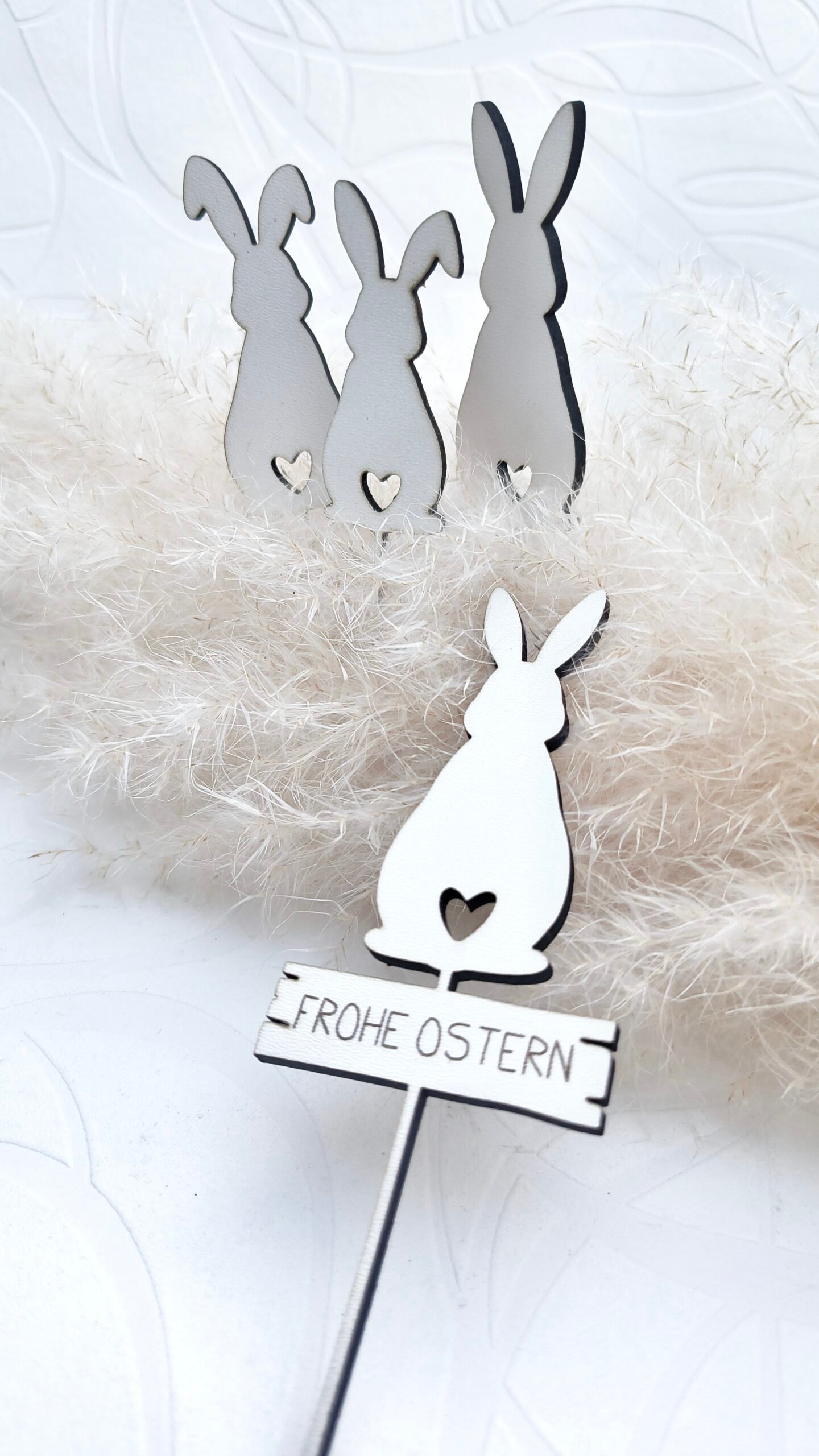 Die Mischung aus schlichten Hasensilhouetten, einer kleinen Hasenfamilie sowie Eiersteckern mit Muster
