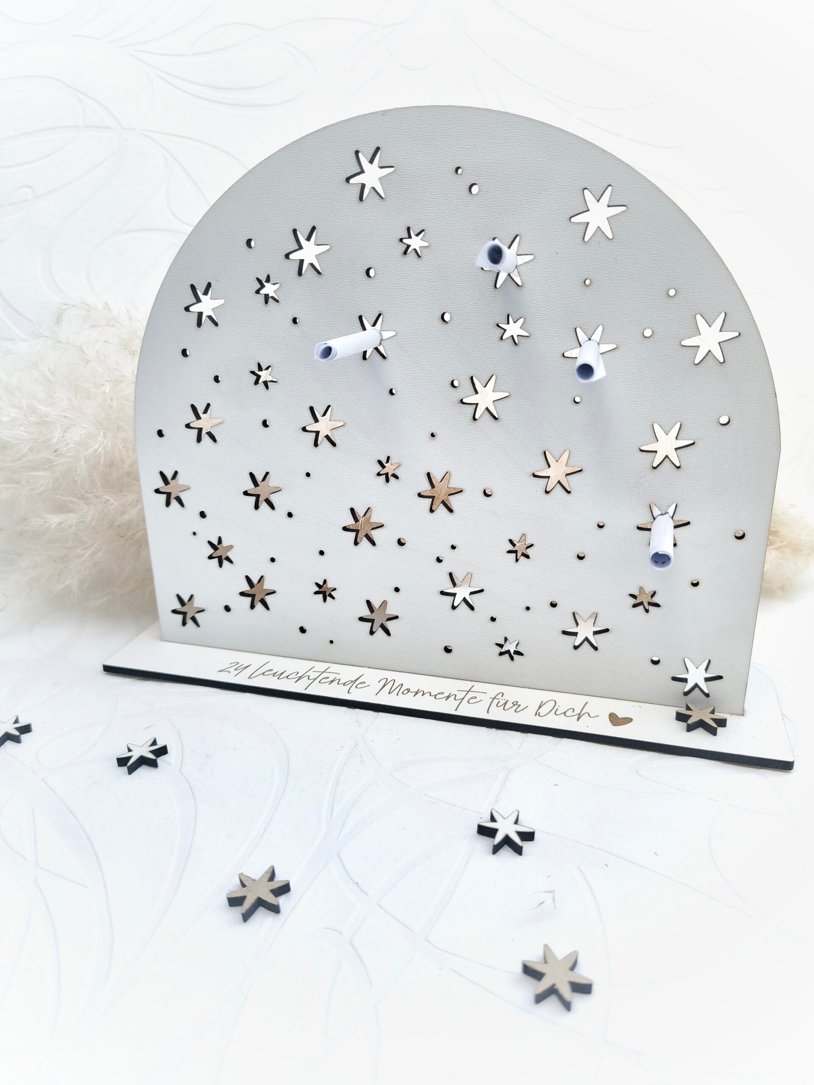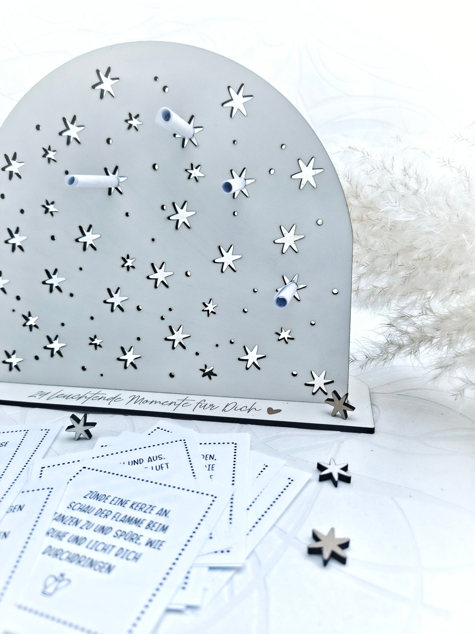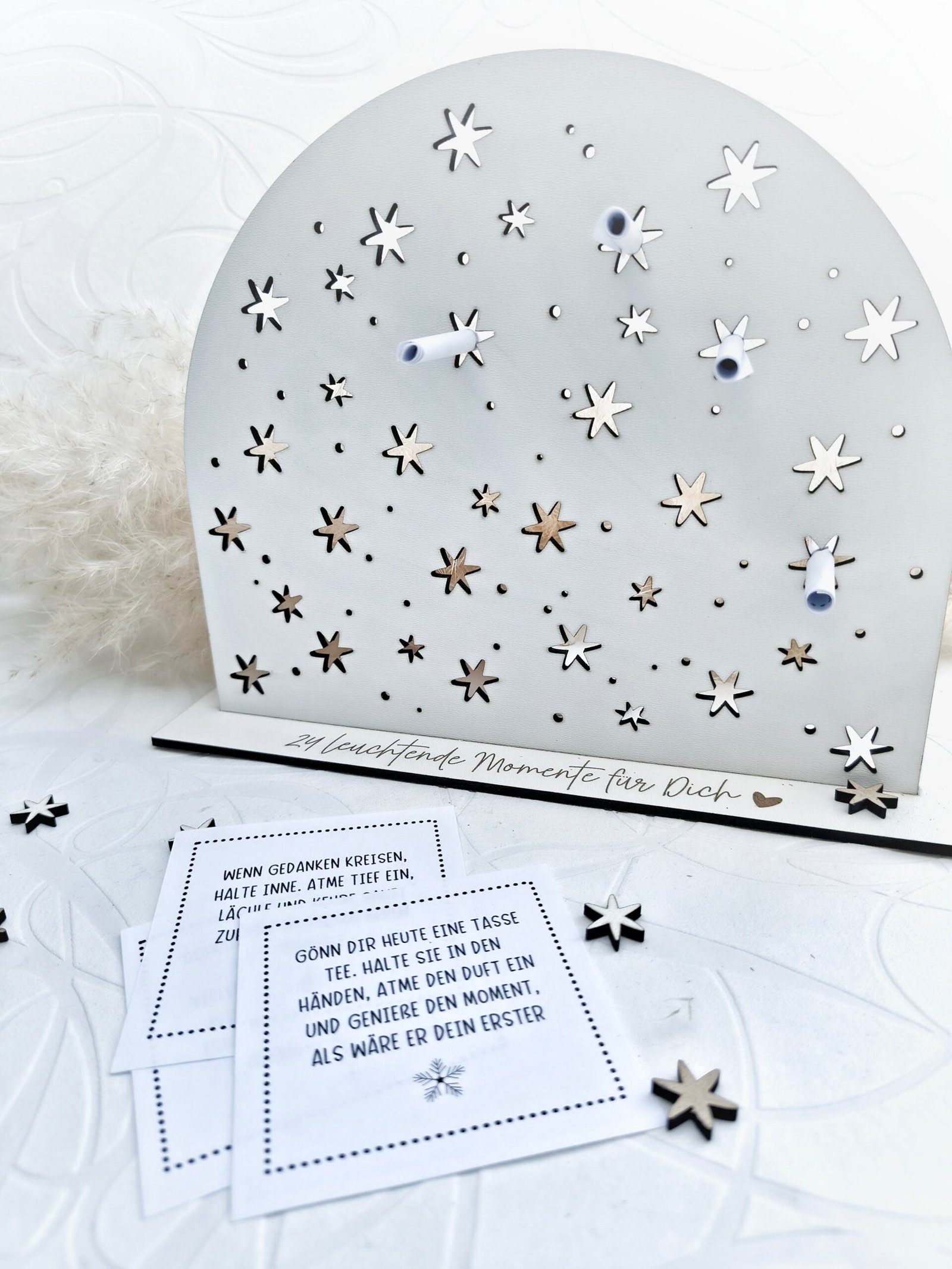 In die 24 Sterne kannst du kleine gerollte Botschaften stecken: Achtsamkeitssprüche, persönliche Worte,