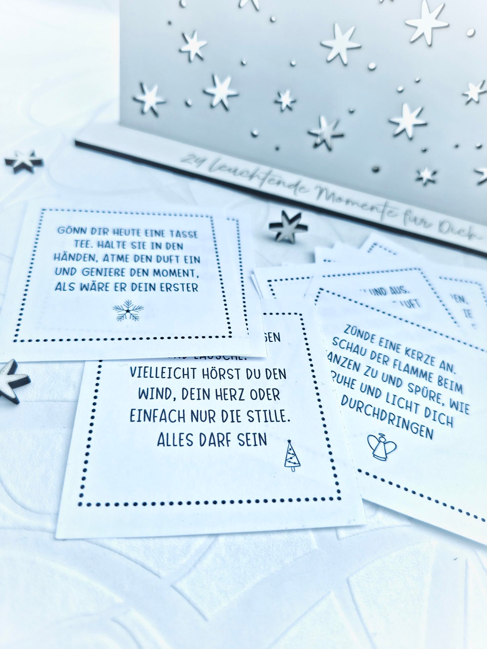 als Achtsamkeits-Adventskalender, der dich 24 Tage lang begleitet. als persönliches Geschenk, gefüllt mit deinen eigenen Worten, Wünschen oder kleinen Gutscheinen, als Motivations- oder Mutmach-Aufsteller fürs Büro oder Zuhause, als liebevolle Coaching- oder Therapie-Begleitung, z. B. mit wöchentlichen Impulsen, als Dankbarkeitsritual: jeden Tag einen Stern ziehen und einen schönen Moment notieren, als Jahresbegleiter, z. B. 24 Ziele, Affirmationen oder Erinnerungssätze, als Überraschungs-Sternenhimmel für Geburtstage, Jubiläen oder besondere Anlässe